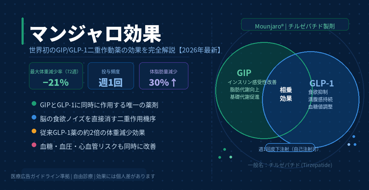 本記事は一般的な医療情報の提供を目的としており、特定の治療・薬剤・クリニックの使用を保証・推奨するものではありません。マンジャロは医師の処方が必要な医薬品であり、ダイエット・肥満症治療目的での使用は自由診療(適応外使用)となります。臨床試験データは主に海外の肥満者を対象にしたものであり、すべての日本人に同様の効果が得られるとは限りません。効果・副作用には個人差があります。使用を検討される場合は必ず医療機関を受診し、医師の指示に従ってください。本記事の情報に基づいた自己判断による使用についての一切の責任は負いかねます。